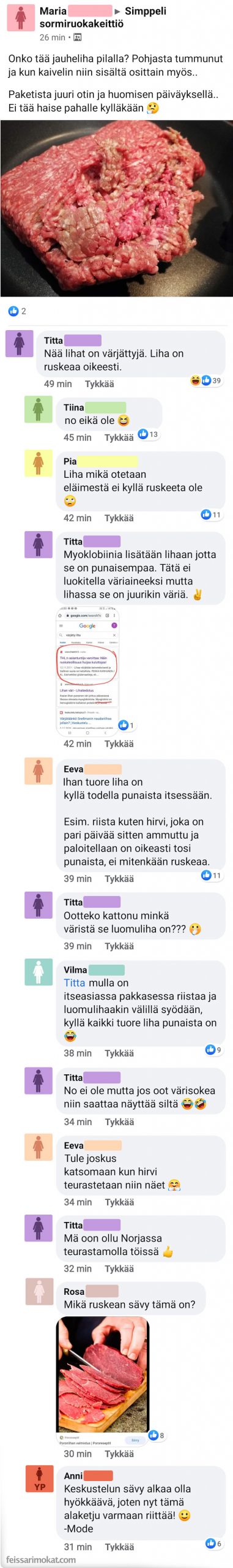 Simppeli sormiruokakeittiö -nimisessä Facebook-ryhmässä keskusteltiin lihan oikeasta väristä. Titta kertoi, että liha on oikeasti ruskeaa, mutta ruokateollisuus lisää siihen myoklobiinia, jotta tuote näyttäisi houkuttelevammalta kuluttajalle.