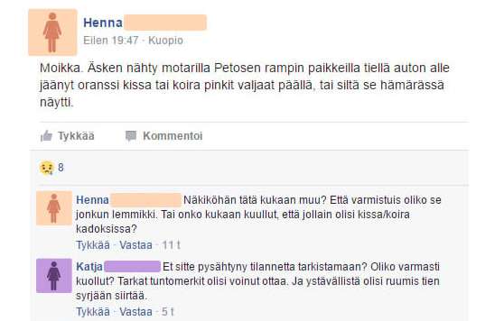 Oheisessa keskustelussa pohdittiin mitä kuolleelle eläimelle pitäisi tehdä, jos sellaisen näkee moottoritien varrella. Arka aihe sai monet ottamaan voimakkaasti kantaa ja lopulta tilanteesta väiteltiin oikein kunnolla. Voit lukea keskustelun alapuolelta.