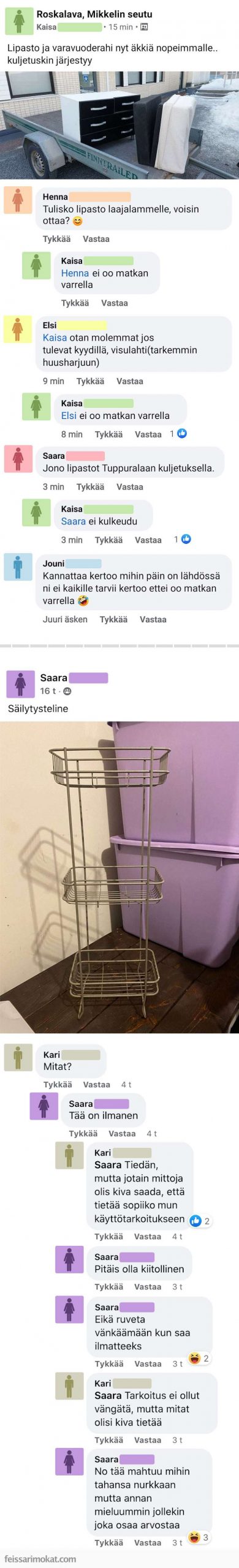 Feissarimokat: Saara antaa telineen ilmaiseksi, mutta sen mittoja ei saa kysyä – ”pitäisi olla kiitollinen”