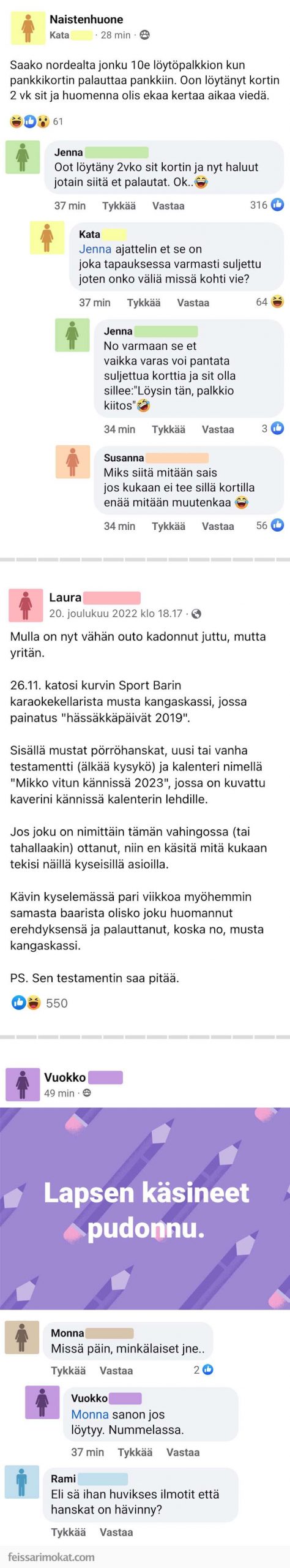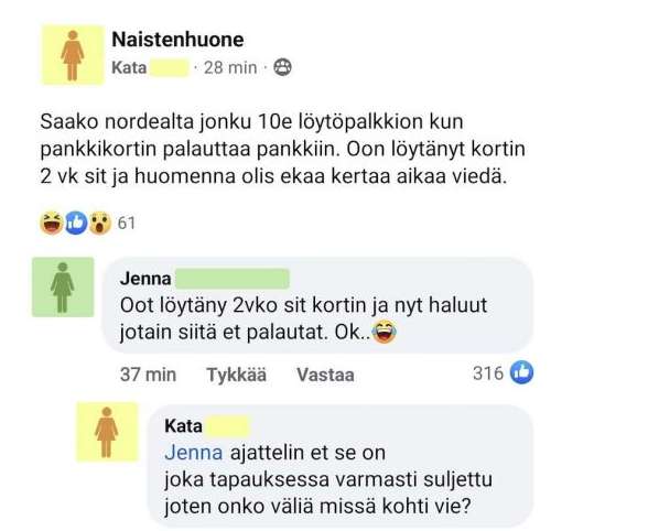 Feissarimokat: saisiko löytöpalkkiota vaikka ei jaksa palauttaa korttia