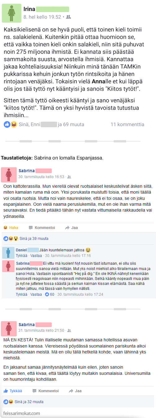 Olet saattanut joskus olla Ruotsissa tilanteessa, jossa porukkasi puhuu suomea avoimesti ja joudut muistuttamaan, että aika moni ruotsalainen osaa myös suomen kieltä. Ulkomailla oleminen ei tarkoita sitä, etteikö ympärillä voisi olla ihmisiä, jotka osaavat kieltäsi. Tämä asia tuntuu olevan monille erittäin vaikea asia ymmärrettäväksi. Alla olevissa feissarimokissa kaksikieliset ihmiset jakavat kokemuksiaan kotimaasta ja ulkomailta.