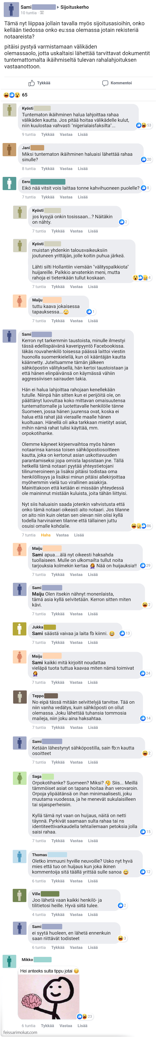 Ryhmässä olevat henkilöt yrittivät varoittaa Samia toteamalla, että kyseessä on varma huijaus. Sami ei kuitenkaan tuntunut piittaavan neuvoista, sillä hänen mielestään viesti kuulosti ja vaikutti aidolta.