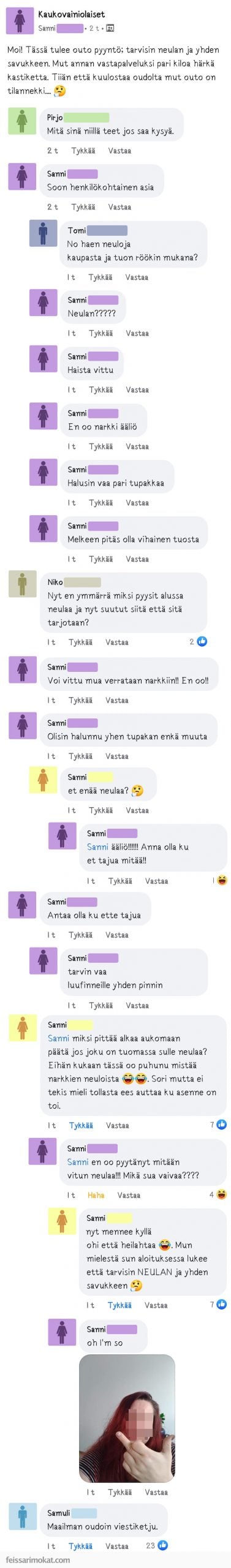 Keskustelu jatkui ja muut yrittivät selvittää miksi ihmeessä Sanni suuttui, kun hänelle tarjottiin vain pyydettyjä asioita. Sanni kuitenkin intti edelleen vastaan ja väitti ettei ole pyytänyt saada keneltäkään neulaa. Julkaisun alussa sana ”neula” näkyy kuitenkin todella selvästi.