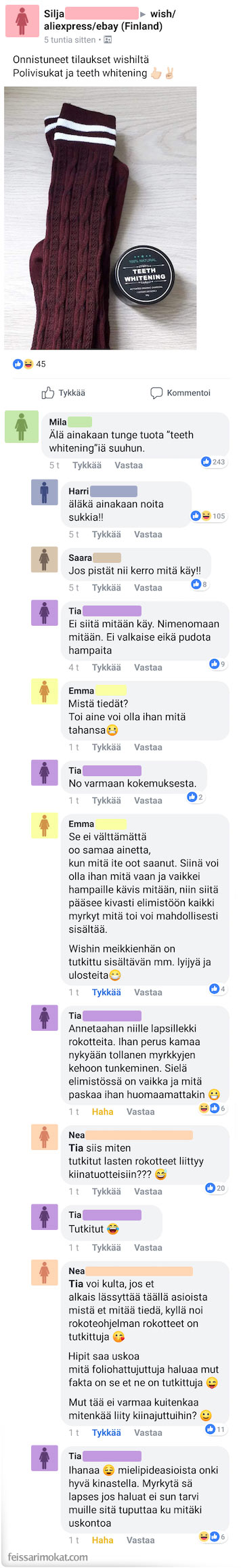 Kaikkea ei kuitenkaan kannata tilata netistä, sillä tuotteiden laatu voi vaihdella merkittävästi. Yksi esimerkki tavaroista, joita en tilaisi Kiinasta ovat hampaiden valkaisuun tarkoitetut mönjät. Tuotteet voivat olla toki täysin turvallisia, mutta en haluaisi ottaa riskiä että tunkisin suuhuni epämääräistä mönjää joka voisi aiheuttaa ikäviä seurauksia. Silja ei tuntunut pelkäävän Kiinasta tilattua ainetta joka oli tarkoitettu hampaiden valkaisuun. Hänen ystävänsä yrittivät kuitenkin varoittaa että tuotteet voivat sisältää kemikaaleja ja raskasmetalleja…Silja alkoi puhua rokotuksista