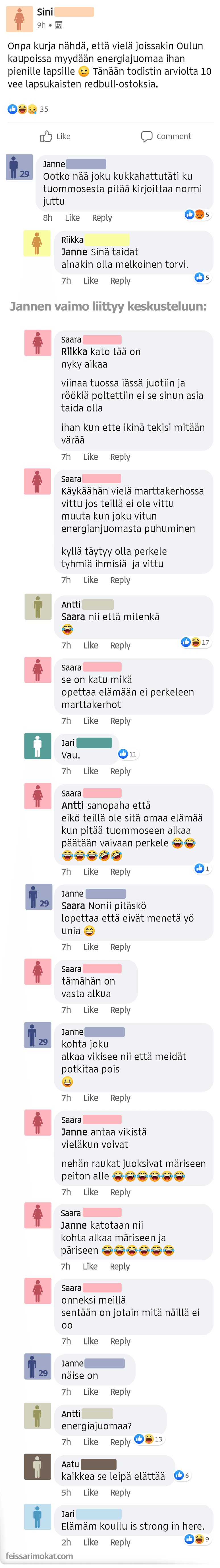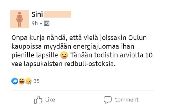 Tämän vuoksi oli siis aiheellista kritisoida Oulussa sijaitsevaa kauppaa, joka myi arviolta 10-vuotiaalle lapselle energiajuomaa. Tämän jutun salaisuus ei kuitenkaan piile energiajuomissa vaan siinä kuinka kaksi elämänkoululaista tuli pätemään Sinin julkaisuun. Heidän kommenttiensa lukeminen oli kirjaimellisesti hämmentävää.