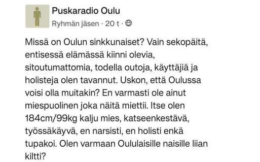 Feissarimokat: sinkkumies etsii naisia Oulusta – ei onnistu tekemään vaikutusta