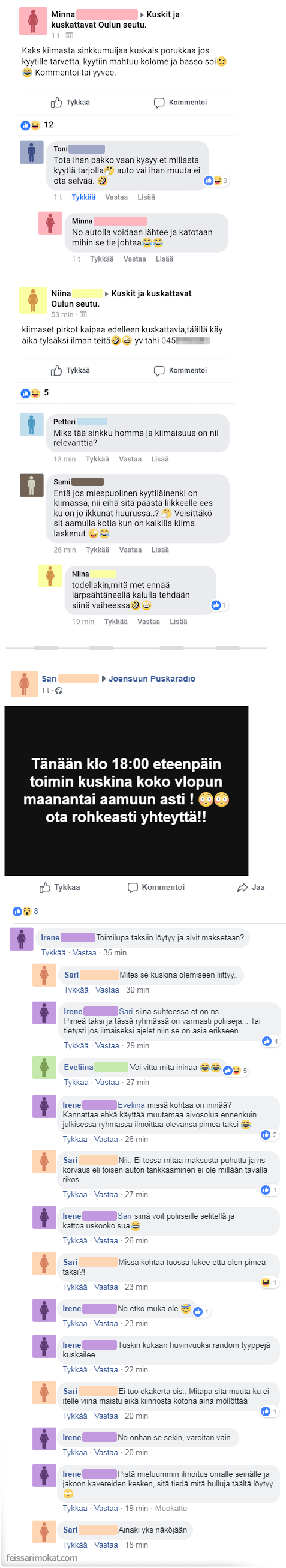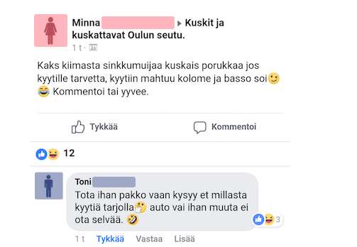 Facebookissa on lukuisia ryhmiä, joissa ihmiset voivat tarjota toisilleen kyytejä.Ryhmissä on paljon asiallisia tarjouksia, mutta mukaan mahtuu myös tietenkin erikoisuuksia.