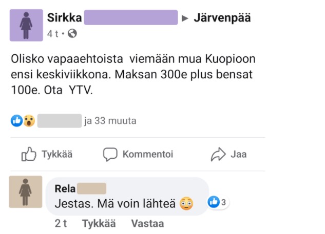 Sirkka kertoi Järvenpää -ryhmässä tarvitsevansa keskiviikkona kyytiä Kuopioon. Tarinasta tekee poikkeuksellisen se, että hän tarjoutui maksamaan 300 euroa + 100 euron bensarahan henkilölle joka vaivautuisi auttamaan.