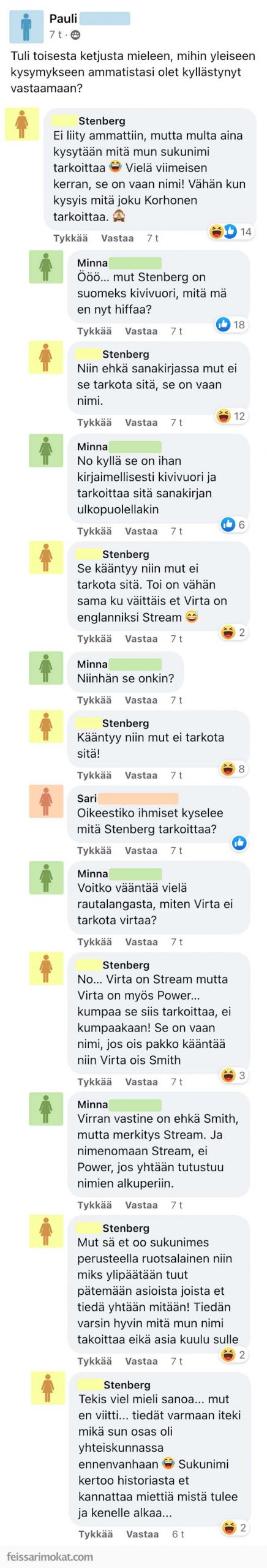 Sukunimistä syntyy harvemmin näin suurta mekkalaa, mutta tällä kertaa pääsi kuitenkin käymään niin. Muutama henkilö keskusteli siitä, mitä sukunimet tarkoittavat ja tämä sai erään ”Stenbergin” pahoittamaan mielensä. Hänen mukaansa sukunimet eivät tarkoita mitään.