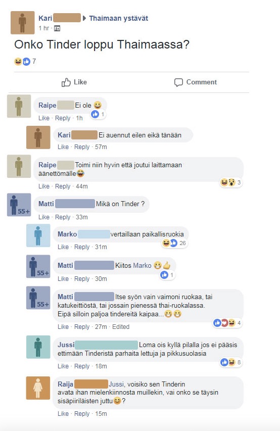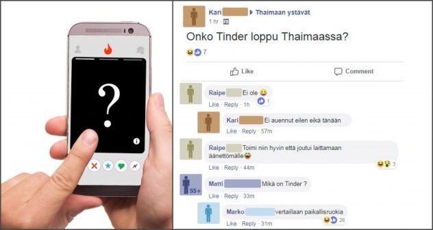 Facebookissa käydyssä keskustelussa oltiin huolissaan siitä, onko Tinder lopetettu Thaimaassa. Sovellus ei ollut Karin mukaan auennut pariin päivään.