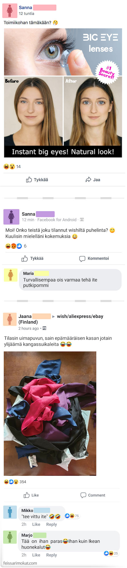 Feissarimokat.com julkaisee tasaisin väliajoin tilapäivityksiä, joissa ihmiset kummastelevat tai kauhistelevat kiinalaisessa verkkokaupassa myynnissä olevia tuotteita. Osaan julkaisuista mahtuu myös tilattuja tuotteita, jotka eivät todellakaan vastanneet toiveisiin tai odotuksiin.