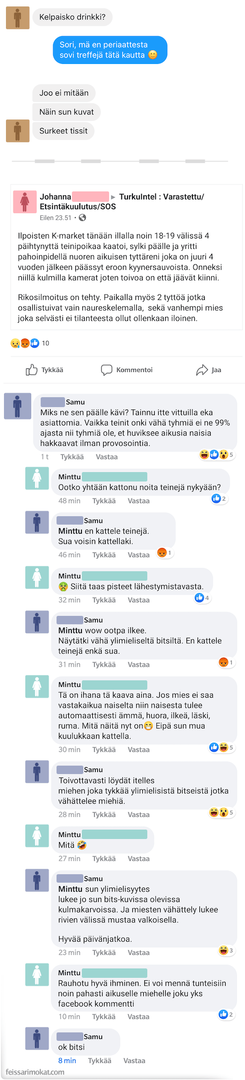 Feissarimokat: suomalaismiehet iskevät naisia: ensin yritetään pokata ja jos ei onnistuta niin haukutaan