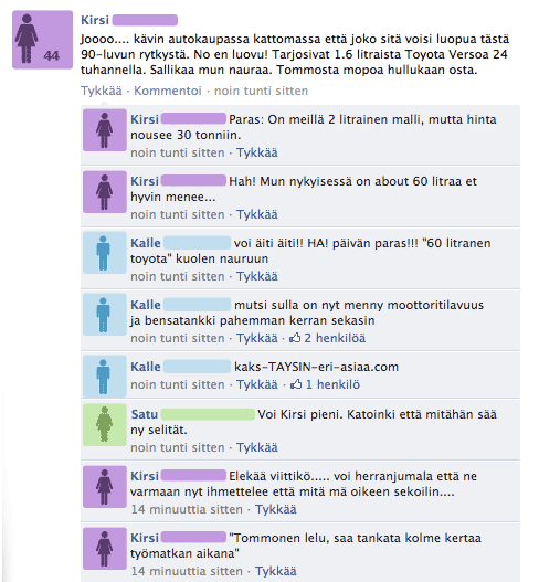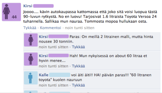 44-vuotias Kirsi naureskeli autokaupassa 1.6 litraiselle Toyotalle, sillä hänellä itsellään on ”60-litranen.” Kirsin hyperauto jättää näillä tehoilla viivalle Lamborghinit ja Bugatit… Kirsin poika, Kalle, tuli nopeasti korjaamaan tilannetta, mutta äiti ei tuntunut ottavan neuvoja vastaan. Tämän seurauksena heidän keskustelunsa päätyi aina feissarimokiin asti. :)