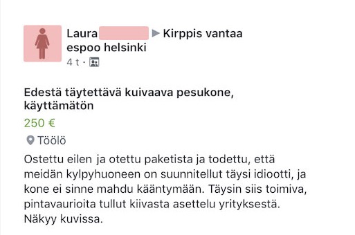 Feissarimokat: suomalaisnainen osti uuden pesukoneen, mutta unohti merkittävän yksityiskohdan