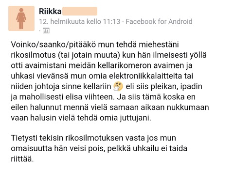 Ryhmissä on tapana keskustella asioista suoraan ja sen kummempia kiertelemättä. Naiset avautuvat usein parisuhde- ja henkilökohtaisista ongelmista muille naisille, jotka kertovat oman näkökulmansa tilanteeseen. Ryhmä tarjoaa myös ongelmanratkaisua vaihtelevalla menestyksellä. Löydät alla olevasta kuvasta kolme tilapäivitystä, joista toinen oli ehdottomasti suosikkini. Riikka halusi haastaa miehensä oikeuteen, koska mies oli vienyt hänen elektroniikkalaitteiden piuhoja kellariin.