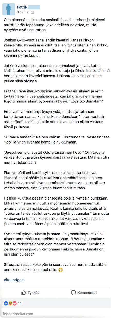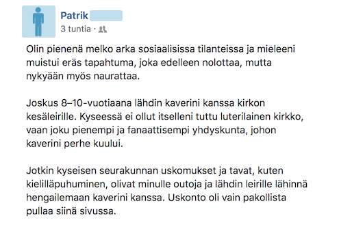 Patrik halusi jakaa tarinan, joka nolottaa ja naurattaa häntä vielä tänäkin päivänä. Patrik oli tarinan sattuessa noin 8 – 10-vuotias. Nuori poika oli päättänyt lähteä kaverinsa kanssa kirkon järjestämälle uskonnolliselle kesäleirille. Kyseessä ei ollut kuitenkaan luterilaisen seurakunnan kesätapahtuma, sillä Patrikin mukaan kesäleirin porukka koostui huomattavasti pienemmästä ja fanaattisemmasta lahkosta. Voit lukea alapuolelta koko tarinan: