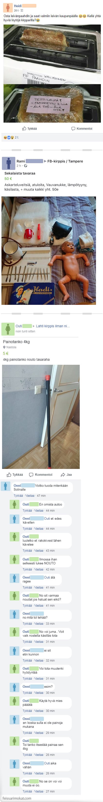 Kirpputoreilla myynnissä olevien tavaroiden laatu voi vaihdella merkittävästi – joskus eurolla voi saada jotain mieletöntä, kun taas joskus 10 eurolla ostettu tuote ei välttämättä ole toivotunlainen. Nettikirppareilla löytöjen tekeminen voi olla entistä vaikeampaa, kun tuotetta ei pääse tarkastelemaan fyysisesti. Feissarimokat kokosi erikoisia myynti-ilmoityksia Facebookin kirpputoreilta. Mukana on leivänpaahdinta, sekalaista tavaraa sekä painotanko, joka aiheutti kiistan.