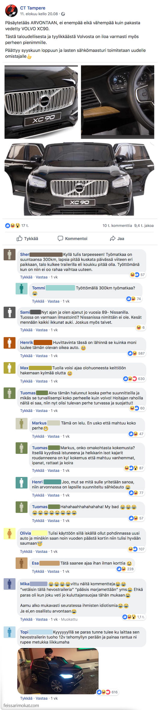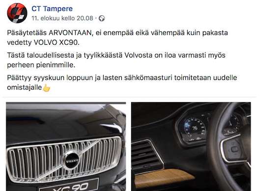 Jokainen suomalainen on luultavasti tähän mennessä osallistunut jonkinlaiseen some-arvontaan. Yleensä arvontoja tehdään Facebook-sivujen kasvattamiseksi sekä brändin kiillottamiseksi. Somessa liikkuu kuitenkin myös huijauksia, joiden tarkoituksena on kerätä pelkkää näkyvyyttä ja kasvattaa sivun kokoa – mitään ei siis todellisuudessa arvota. Tässä tapauksessa arvonta oli todellinen, mutta ihmiset käsittivät sen täysin väärin. CT Tampere oli pistänyt arvontaan Volvo XC90 -mallisen lasten sähköauton. Ihmiset eivät malttaneet lukea ilmoitusta kunnolla ja alkoivat kertoa, kuinka paljon he tarvitsisivat uutta työautoa. Tämä arvonta on hyvä osoitus siitä, kuinka sosiaalinen media saa ihmismassat huutelemaan todellisia perättömyyksiä. Vinkki tulevaisuutta ajatellen: Lue juttu, mieti hetki ja kommentoi vasta sitten. :)