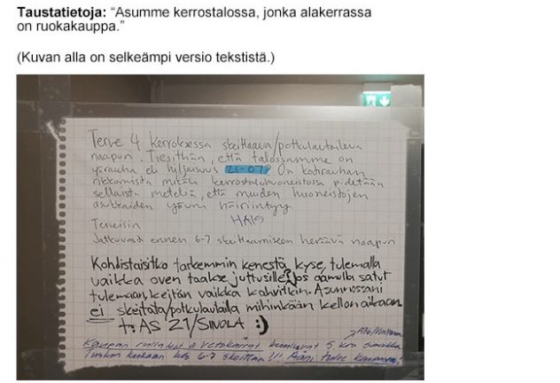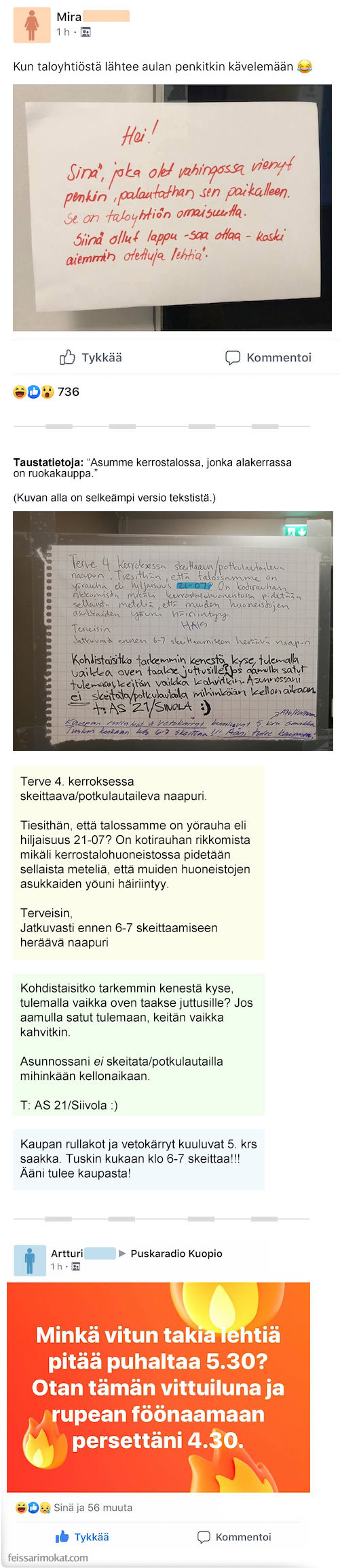 Kerrostalossa asuminen voi aiheuttaa ongelmallisia tilanteita, jos naapurit eivät ole kanssasi samalla aaltopituudella. Minulla on lukuisia esimerkkejä tällaisista tapauksista, mutta en jaksa alkaa luettelemaan niitä tähän… On täysin luonnollista, että kymmenien ellei jopa satojen asuntojen taloyhtiössä syntyy erimielisyyksiä. Ihmiset eivät nimittäin todistetusti osaa elää pitkään sovussa ja jos kaikki on hyvin, niin ongelmia täytyy alkaa etsiä lähistöltä. Tämä ilmenee muun muassa toisten kyyläämisenä, vahtimisena ja lappujen jättämisellä. Joskus valittaminen on täysin oikeutettua, mutta joskus kannattaisi vetää happea ja ottaa iisimmin.