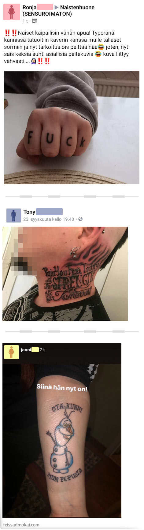 Feissarimokat.com on koonnut säännöllisesti koomisia tatuointimokia Facebookin ihmeellisestä maailmasta ja kuvat eivät jätä lukijoita kylmäksi myöskään tällä kertaa.