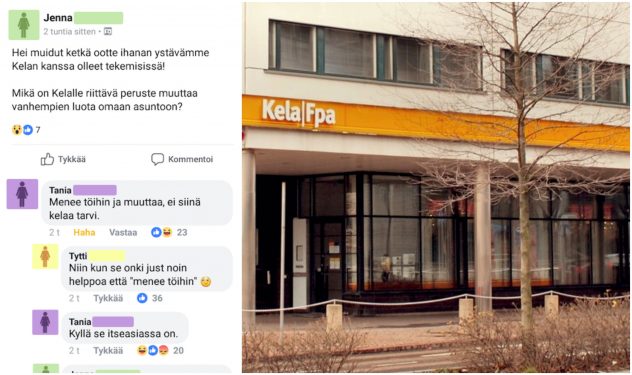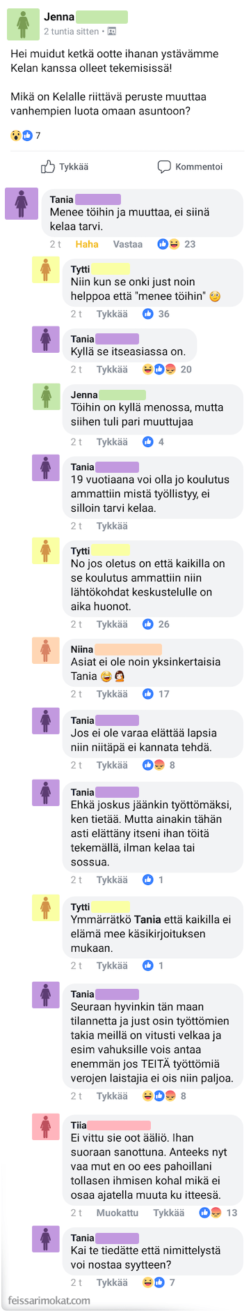Kelan tarjoamia tukia ja apurahoja käytetään joissakin tilanteissa väärin, kun ihmiset ovat yksinkertaisesti liian laiskoja tekemään töitä. Samalla on hyvä muistaa että Kela saa suuren osan rahoistaan verojen muodossa ihmisiltä, jotka tekevät töitä. Tästä syystä moni kovaa raatava ihminen saattaa olla katkera siitä että joku makaa kotona, eikä viitsi edes hakea itselleen töitä, kun rahaa tulee ilmaiseksi. Jenna halusi tietää, millaisin perustein hän voisi muuttaa vanhempiensa luota pois. Hänen tarkoituksenaan oli ilmeisesti saada asumistukea Kelalta. Tania -niminen nainen huomasi Jennan päivityksen ja alkoi tilittää mielipiteitään vihaisena.