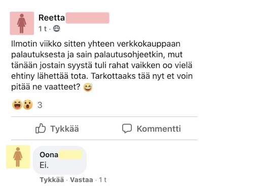 Jokin verkkokauppa oli palauttanut Reetalle rahat ja toimittanut samalla tuotteen palautusohjeet. Suomalaisnainen kuitenkin ajatteli ettei hän palauttaisi tuotetta lainkaan takaisin saatuaan rahansa takaisin. Itse en uskaltaisi muutaman kympin vuoksi riskeerata omaa mainettani.