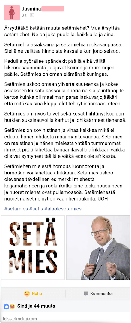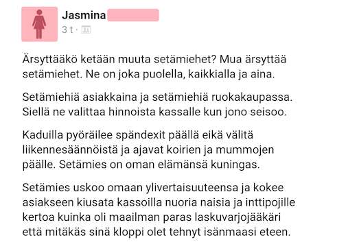 Jasmina kirjoitti vihaavansa setämiehiä ja kuvauksen perusteella en ihmettele lainkaan miksi.