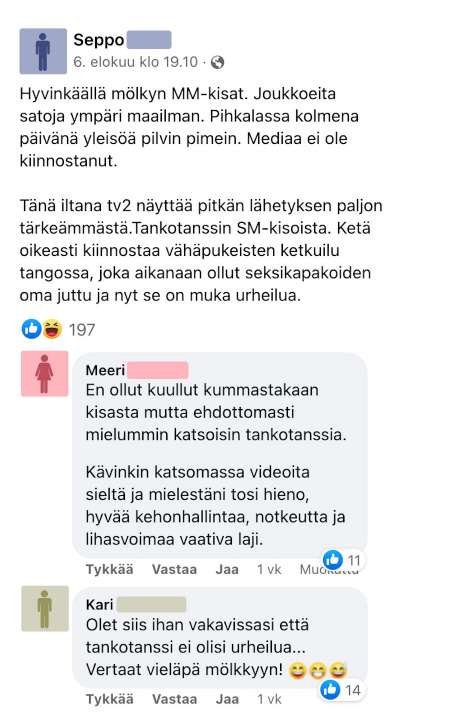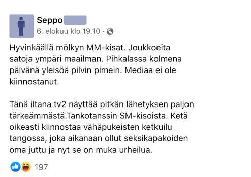 Sepon mukaan Hyvinkäällä järjestetyssä kilpailussa oli valtava määrä osallistujia, mutta televisiosta näytettiin silti tankotanssin SM-kisoja.