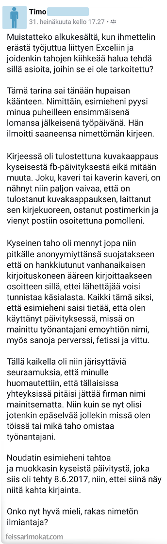 Feissarimokat: Timo julkaisi päivityksen: pomo palasi lomalta ja kutsui puhutteluun