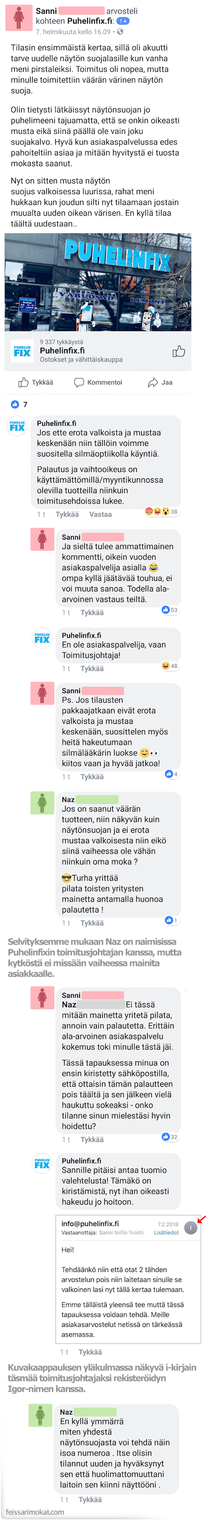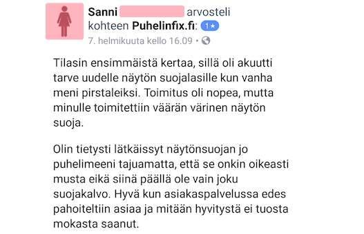 Sanni oli tilannut Puhelinfix -nimiseltä yritykseltä puhelimeensa suojalasin. Lasi oli ollut kuitenkin väärän värinen, jonka jälkeen kiistan ainekset olivat valmiina.