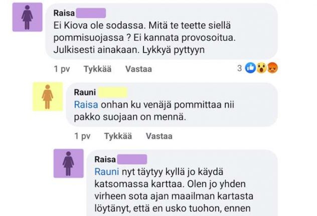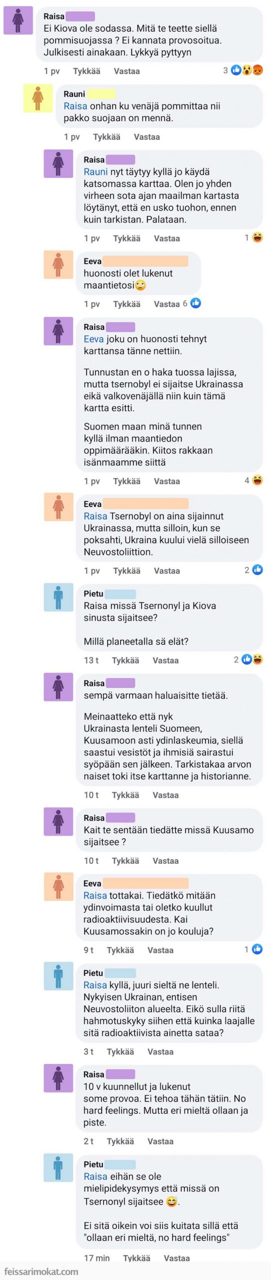 Raisan Facebook-kommentit herättivät hämmennystä, kun hän totesi ettei Kiova ole sodassa ja ettei Tsernobyl sijaitse Ukrainassa. Muut yrittivät selvittää mistä ihmeestä hän oli saanut tällaisen ajatuksen päähänsä.