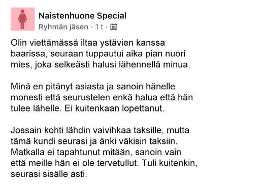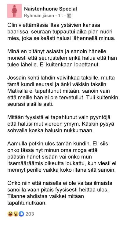Eräs suomalaisnainen kertoi miehestä, joka lähenteli ja ei ymmärtänyt mitä ”ei kiinnosta” tarkoittaa. Tilanne eteni ehdottomasti liian pitkälle, sillä tuntematon mies änki myöhemmin samaan taksiin ja tuli naisen luokse yöksi. Kaikki tämä oli tapahtunut samaan aikaan, kun nainen oli omien sanojensa mukaisesti tehnyt selväksi ettei häntä kiinnosta hengailla miehen kanssa.