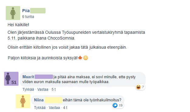 Piia aikoi järjestää Oulussa työuupumuksesta kärsivien ihmisten vertaistukiryhmä tapaamisen ja pyysi ystäviään jakamaan ilmoitusta eteenpäin. Ajatus on itsessään hieno, sillä muiden uupumuksesta kärsivien ihmisten kanssa keskusteleminen voi tuoda apua myös omiin ongelmiin. Muiden kanssa keskusteleminen myös vähentää pelkoa ja stressiä, kun ongelmien kanssa ei tarvitse painia yksin.