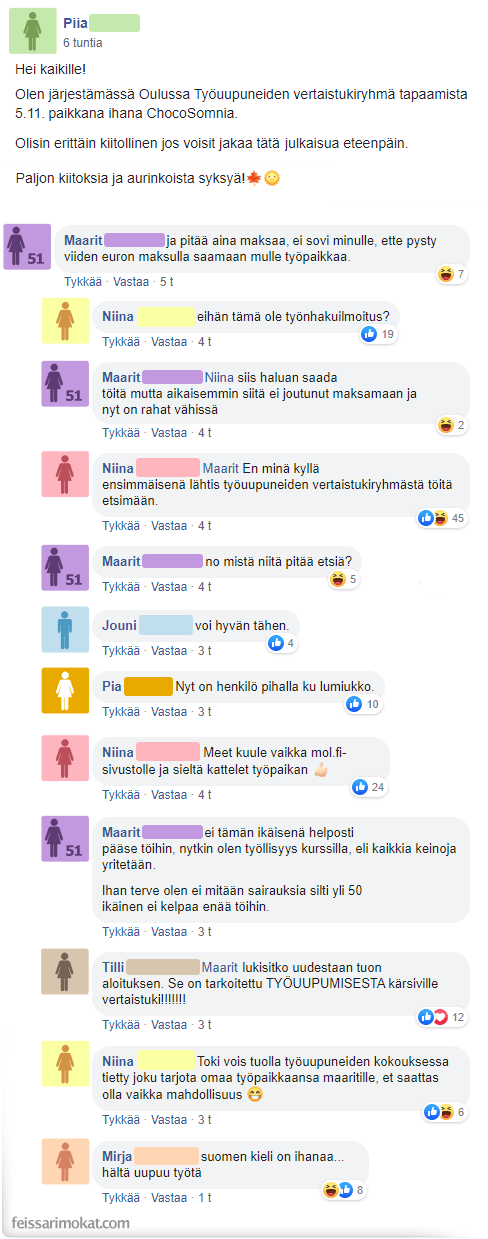 Piian julkaisu sai Maaritin kommentoimaan julkaisua, sillä hän luuli jostain kumman syystä että kyseessä olisi työpaikkailmoitus. Muut yrittivät avata asiaa 51-vuotiaalle naiselle, mutta turhaan.