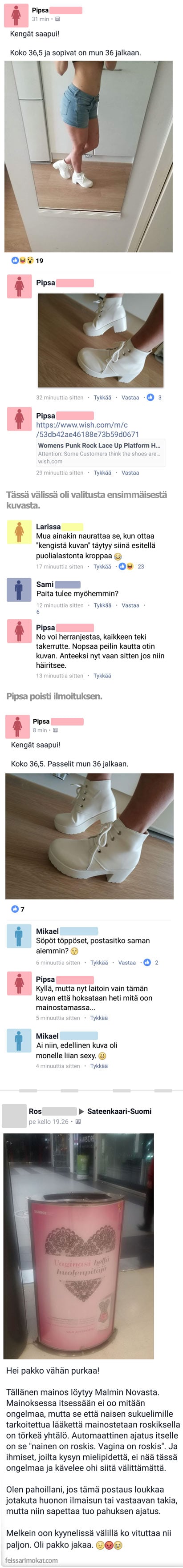 Tiesitkö sinä, että kenkien myynti-ilmoituksesta voi myös pahoittaa mielensä? Voit lukea alapuolelta kaksi julkaisua, joista ihmiset pahoittivat mielensä.