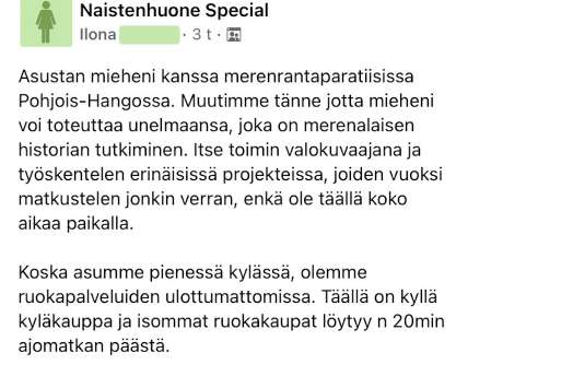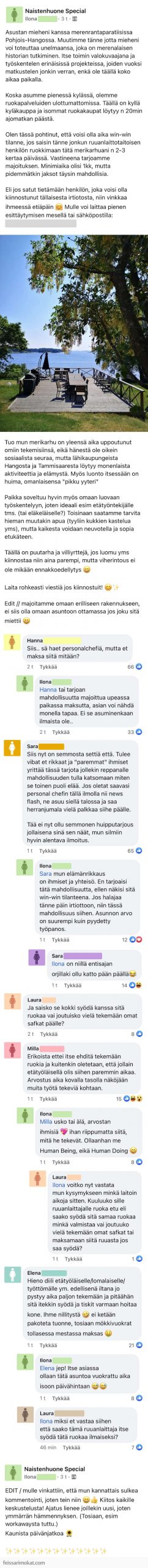 Ilona tarjosi ”unelmien” työpaikkaa Hangossa, jossa hän asuu miehensä kanssa. Ilona ei kuitenkaan suostu maksamaan kokille ja puutarhanhoitajalle rahaa, koska heidän paikkansa on niin upea. Jos joku pitää tästä tarjouksesta niin ei siinä mitään, mutta on ehkä väärin olettaa, että tämä on jokaisen mielestä hyvä diili.
