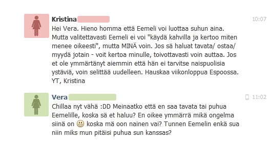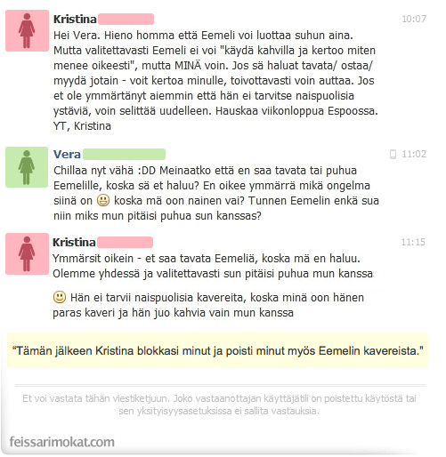Jos puoliso ei saa puhua vastakkaista sukupuolta olevan henkilön kanssa niin jokin on mielestäni pahasti pielessä. “Olen tuntenut Eemelin kaksi vuotta ja juttelen hänelle todella harvoin. Muutama päivä sitten puhuin hänen kanssaan ja hän kertoi minulle kehittelemästään laihdutustuotteesta, jota pyysin saada kokeilla. Yllättäen sain viestin hänen tyttöystävältään, jonka kanssa Eemeli on seurustellut vajaat 6 kk”, Feissarimokat.com kirjoittaa.