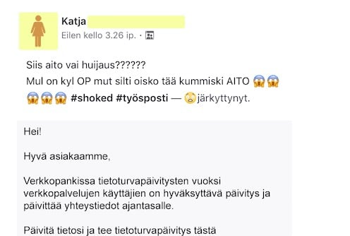 Feissarimokat: verkkopankkihuijaus sai Katjan paineisiin – tilanne muuttui kuitenkin nopeasti