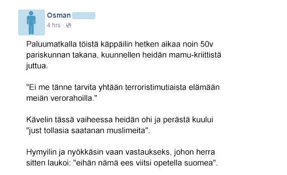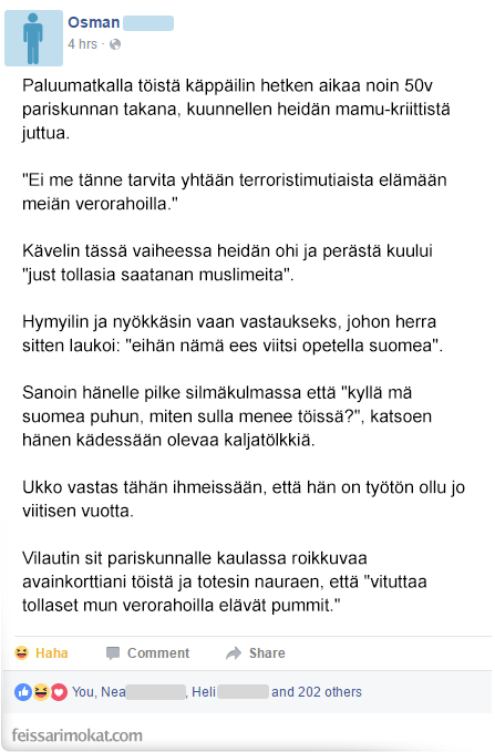 Miehen mukaan pariskunta oli keskustellut kriittisesti maahanmuuttoon liittyen. Maahanmuuttajataustainen Osman päätti haastaa kaksikkoa kysymällä missä he itse työskentelevät. Pariskunta äimistyi kysymyksestä ja mies totesi kaljatölkki kädessään olevansa pitkäaikaistyötön. yhteiskunnan-rasite