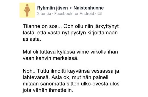 Naistenhuoneessa päästiin jostain syystä keskustelemaan poikkeuksellisen paljon ihmisen ulosteesta ja kuinka sitä päätyi kotisohvalle tai matolle.