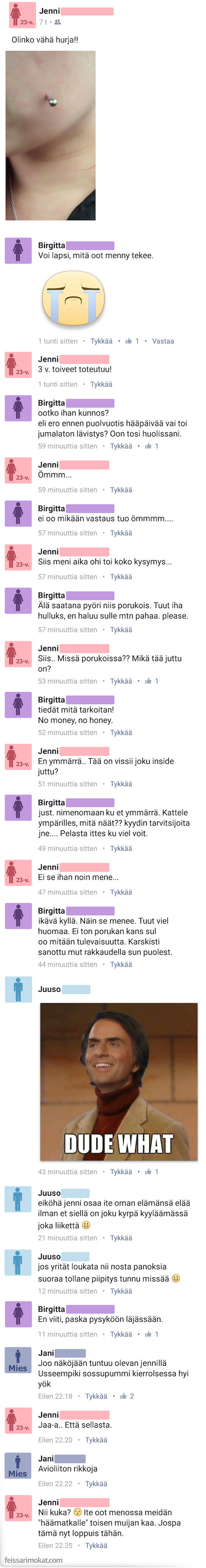 Feissarimokat.com julkaisi jutun, jossa anoppi on kuitenkin poikkeuksellisen vihainen ja päällekäyvä. Minusta tuntuu ettei Jenni edes ymmärtänyt tässä tapauksessa mitä anoppi halusi sanoa.