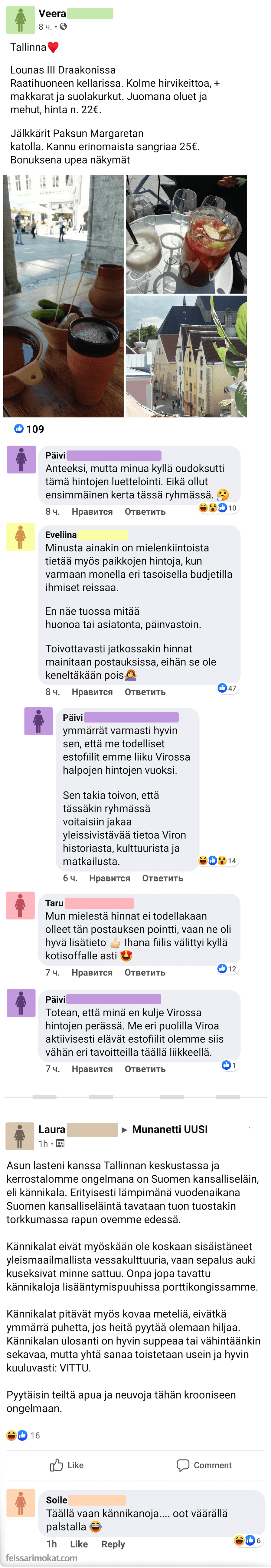 Feissarimokat.com kokosi kaksi Tallinna -aiheista julkaisua, joissa toisessa keskusteltiin siitä onko Facebook-julkaisuun asiallista lisätä myös ravintola-annosten hinnat.