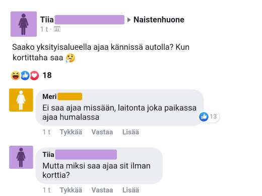 Tiia pohti saako hän ajaa yksityisalueella kännissä autolla, koska yksityisalueella saa ajaa ilman korttia. Mielestäni ei ole kovin järkevää pohtia millaisissa tilanteissa saisi ajaa humalassa, sillä linjana pitäisi olla ettei koskaan ajeta autoa päihtyneenä.