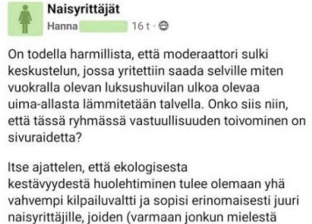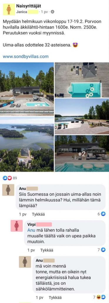 Naisyrittäjät-nimisellä Facebook -sivulla julkaistiin houkuttelevan näköinen tarjous, jossa tavallisesti viikonlopuksi 2500 euroa maksava huvila oli saatavilla 1600 eurolla.