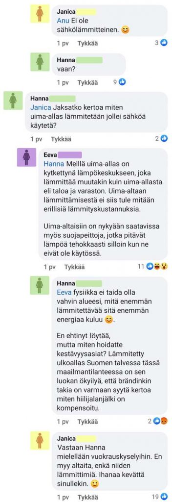 Keskustelu siirtyi kuitenkin yllättävän nopeasti huvilan uima-altaaseen ja siihen, kuinka se lämmitetään. Omasta mielestäni jokainen voi lämmittää altaansa miten haluaa, se näkyy sitten vain sähkölaskussa.