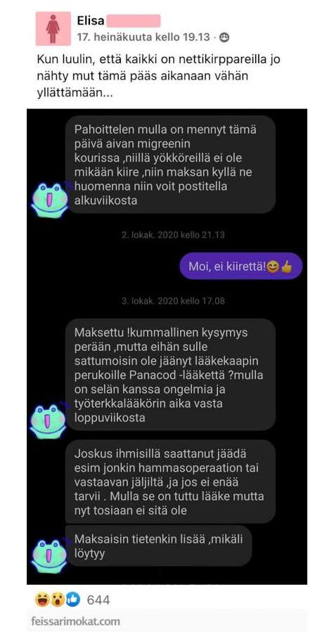 Feissarimokat: yökkärien ostaja halusi myös panacod-lääkkeitä – ”selän kanssa on ongelmia”
