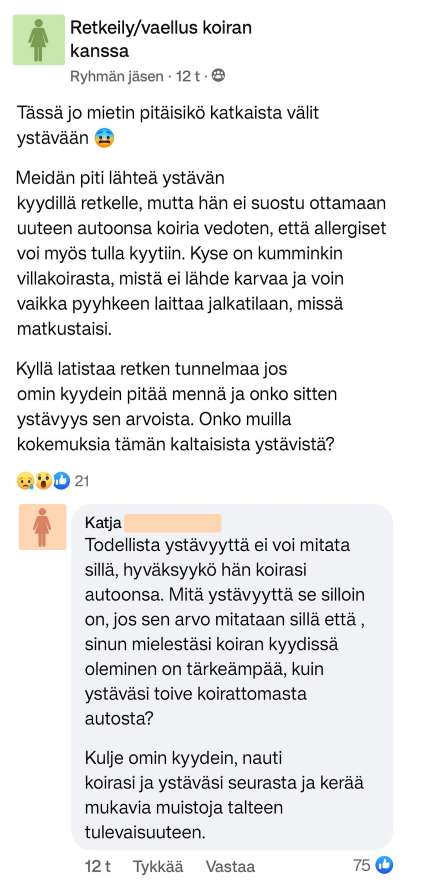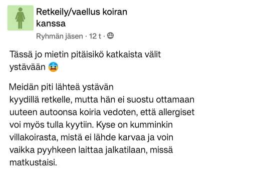 Suomalaisten ystävyys vaakalaudalla: ”Koira ei päässyt autoon, joten pitäisikö katkaista välit?”