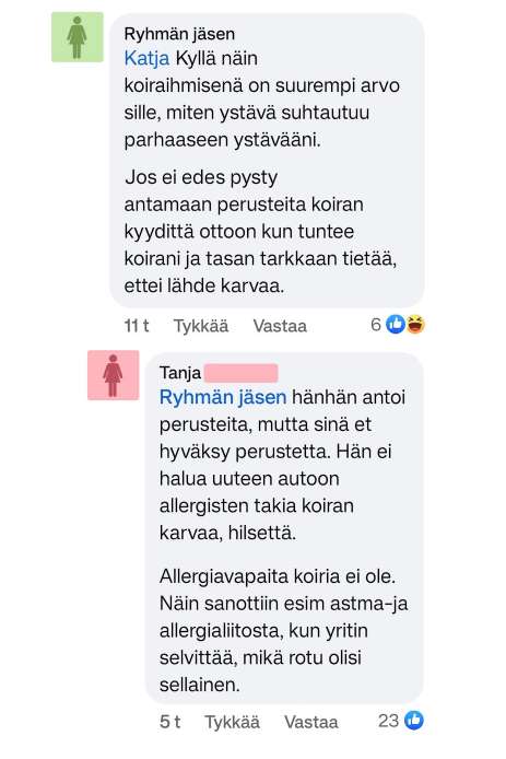 Eräs suomalaisnainen päätti avautua somessa, kun hän ei saanut ottaa koiraa mukaan ystävänsä autoon. Auton omistaja oli perustellut toiveensa mielestäni hyvin, joten tilanteessa ei pitäisi olla mitään epäselvää. Koiranomistaja kuitenkin otti tämän todellisena loukkauksena ja nyt hän pohtii pitäisikö katkaista välit kokonaan.