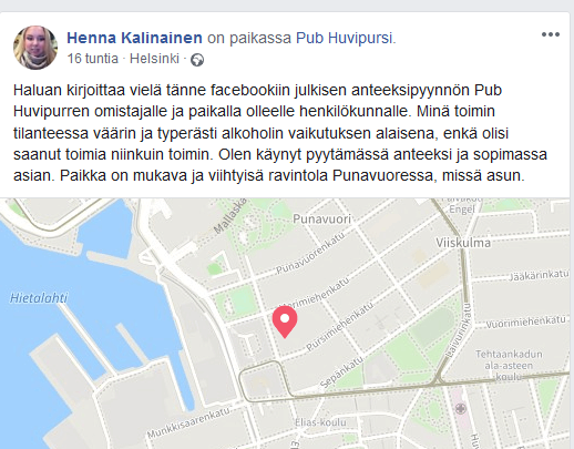 Henna kertoo Facebook-sivuillaan humalassa toimineensa tyhmästi ja pyytäneensä rehdisti anteeksi.