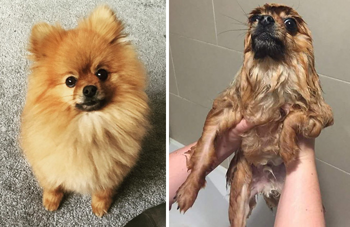 Jokainen koira joutuu jossain vaiheessa elämäänsä pesulle pitivät he siitä tai ei. Mitä kevytkarvaisempi koira on sitä suurempi on niiden ero ennen ja jälkeen pesun. Pesun jälkeen karvat ovat siten, että koko koira muistuttaa jotain toista koiraa lukuunottamatta sen tiettyjä henkilökohtaisia piirteitä. Seuraavissa kuvissa on huvittavan ja säälittävän näköisiä koiria ennen ja jälkeen pesun. 1.
